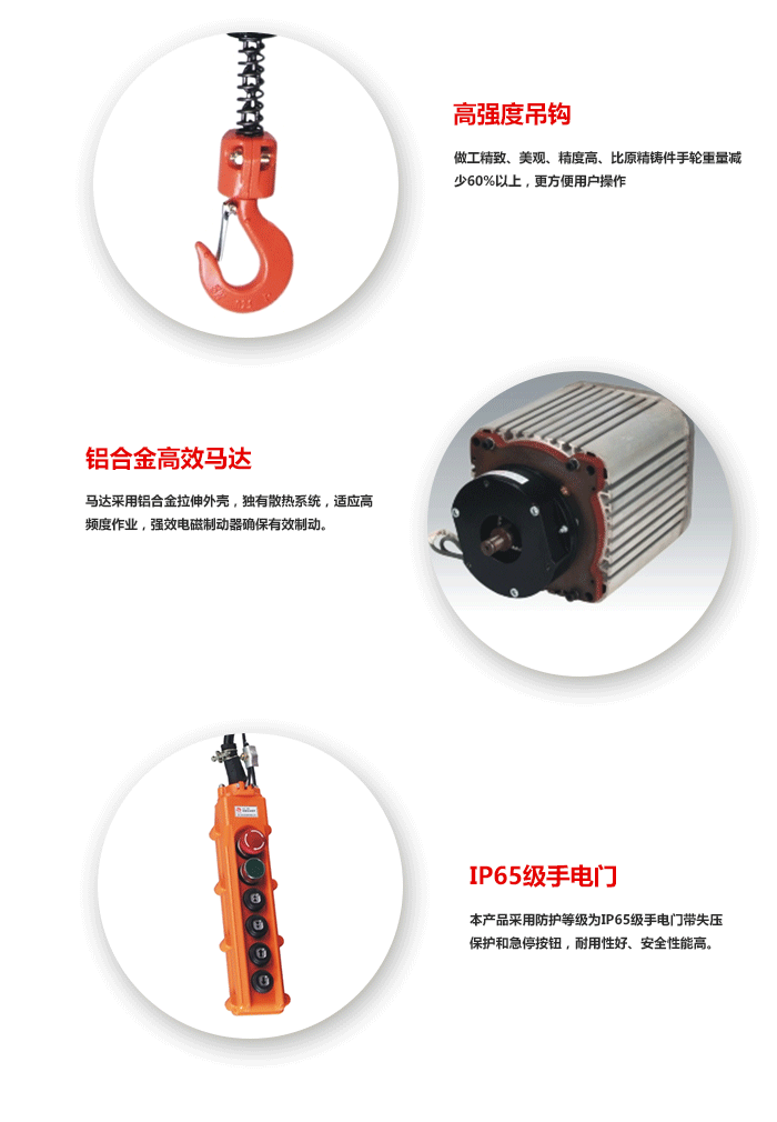 本機(jī)設(shè)有限載保護(hù)裝置,可避免超載時引發(fā)的不良后果;起重吊鉤設(shè)有閉鎖裝置,可防止鎖具意外滑脫;電機(jī)設(shè)有熱保護(hù)裝置,當(dāng)電機(jī)因頻繁使用引起溫升過高時,該裝置會自動切斷電機(jī)以保護(hù)電機(jī)不至于被燒壞;本機(jī)設(shè)有上、下限位裝置,當(dāng)?shù)蹉^上升或下降至極限位時,本機(jī)會自動切斷電源,吊鉤隨即停止動作;本機(jī)設(shè)有緊急停止按鈕,使操作者于危急狀況是,能立即關(guān)閉電源。