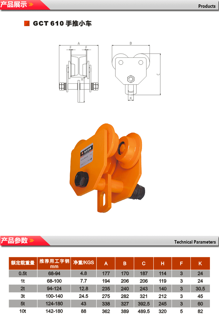 GCL/GCT810系列小車選用了全新的高強(qiáng)度低合金結(jié)構(gòu)鋼,確保4倍安全載荷,輕巧、安全、安裝方便、是目前最為輕巧小車之一。